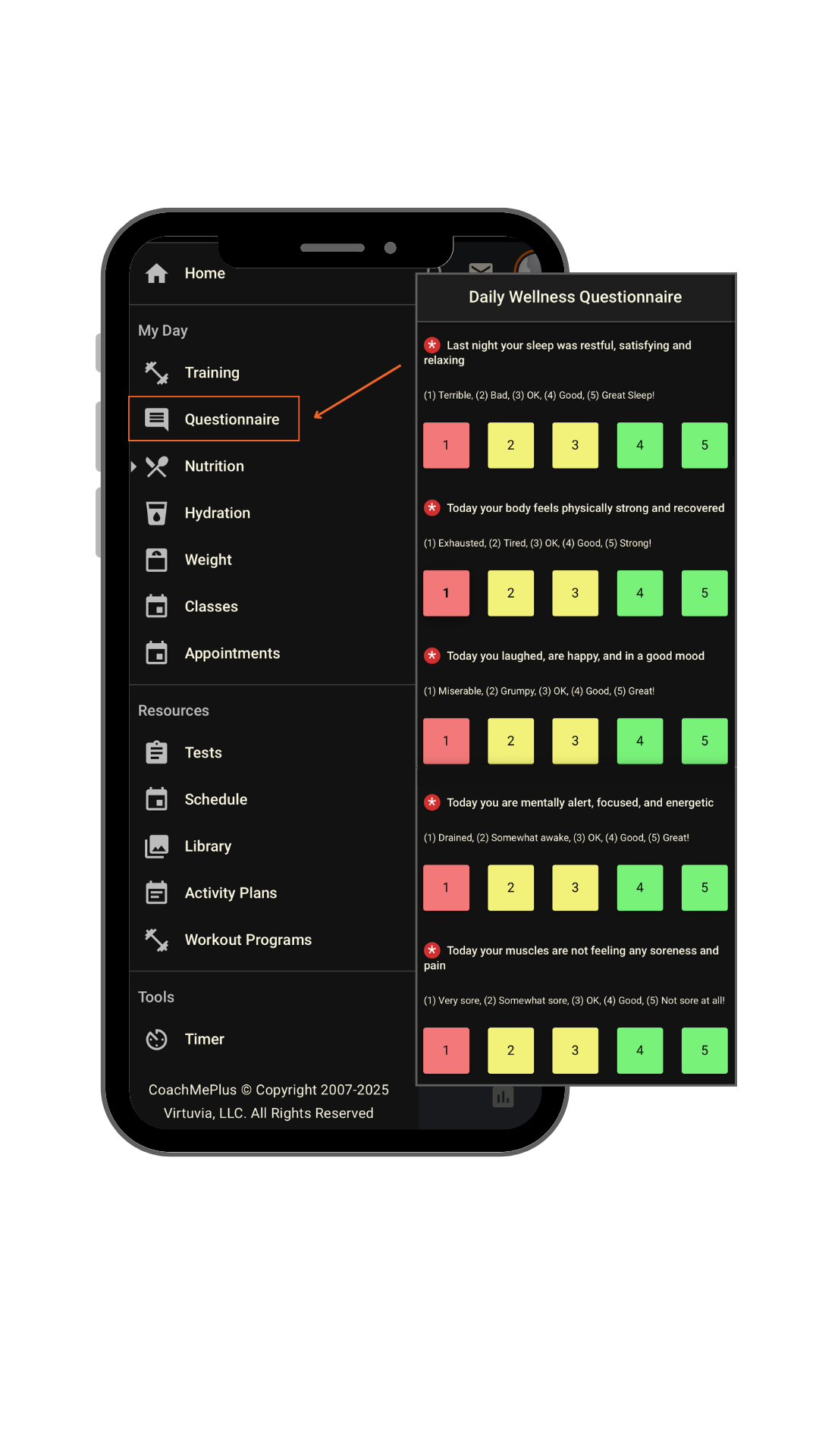 The CoachMePlus wellness questionnaire is a simple, yet cost-effective solution for tracking athlete health and performance. CoachMePlus enables athletes to easily report their daily metrics, including sleep, soreness, stress, fatigue, and mood. The platform logs this data and highlights outliers using color-coded alerts. Coaches and staff can review trends, identify issues early, and adjust training to meet the individual needs of their athletes. The system provides coaches with daily insights into athlete wellness, keeping teams on track for sustained progress and enhanced recovery.